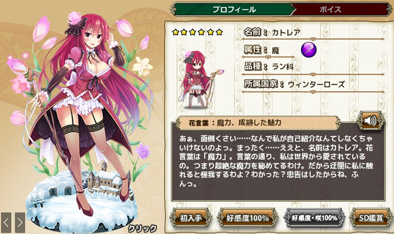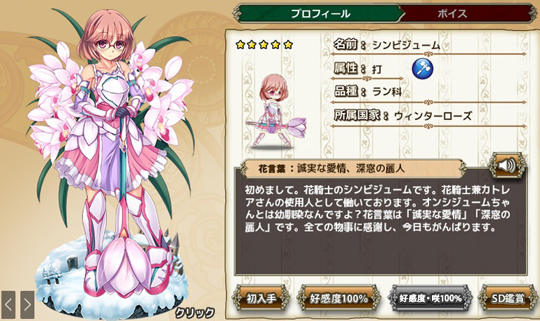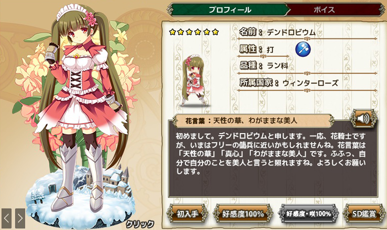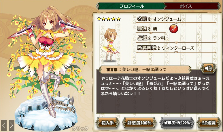 "不思議な力を持つせいで、ここに閉じ込められました。"と言う訳で、誰も寄り付かない辺鄙な屋敷に閉じ込められたカトレアを中心とした取り巻きがお屋敷組というものになるわけです。で、オンシジュームとシンビジュームは彼女の使用人といった関係となっています。尤もこれは現在進行形での人物の相関で、「氷雪の悪魔といばら姫」はこれよりも過去の話となります。そこで主役となるのが次の2人の花騎士。