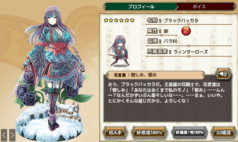 ウィンターローズより西の僻地にある「閉ざされたお屋敷」がそれ。このお屋敷に関わる花騎士たち(先述した子たち)がお屋敷組と呼ばれています。個人的に「閉ざされたお屋敷」の童話の様な古典的なロマンチズムに満ちた語り口が大好きだ。