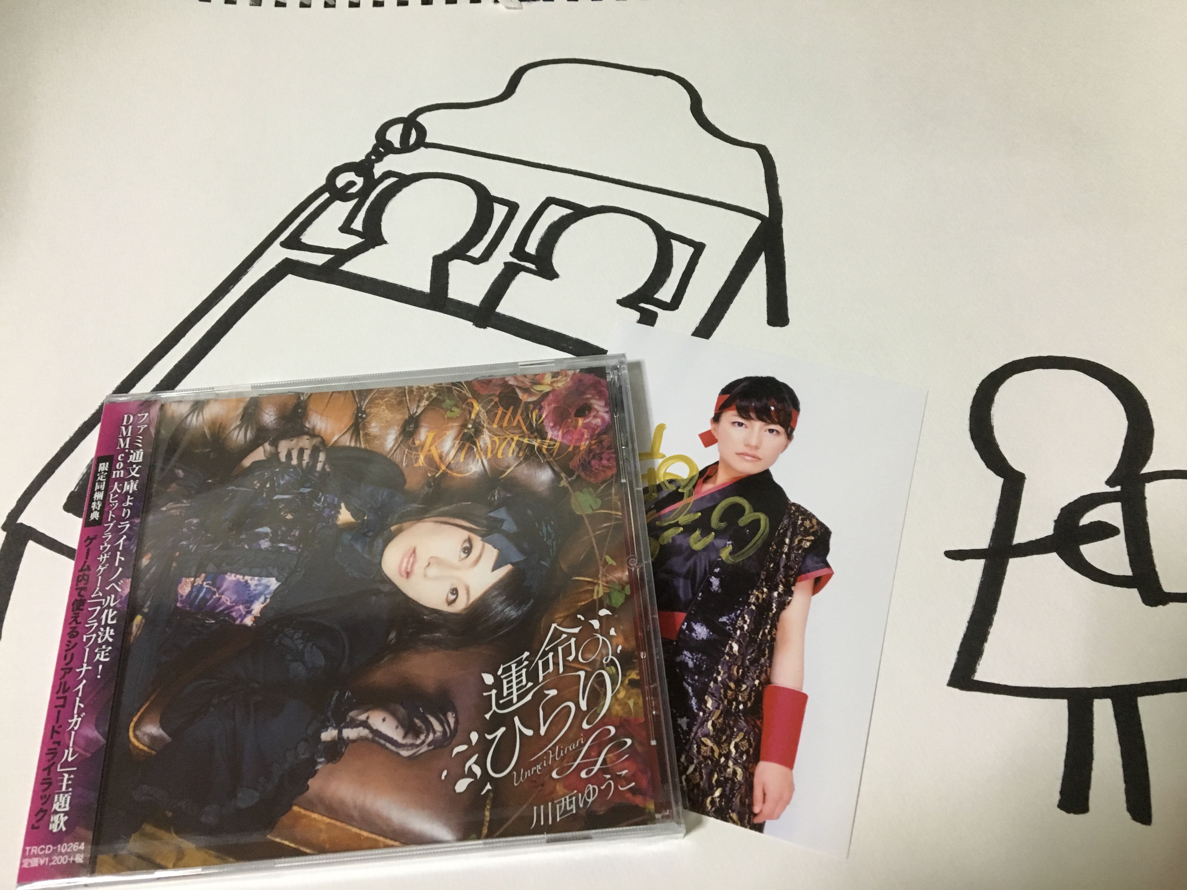 終演後は物販にて持っていなかった『運命 ひらり』を購入。「truth」が一番好き言うときながら持ってなかったとか、どういうこっちゃ?そういう事もあるんだよ。後は「Y・BOY」の暗号に答えて、ニコ生で使用した絵を頂きました。よりにもよって手錠プレイとロリです。ありがとうございます、額縁に入れて飾ろうと思います(ぉ
